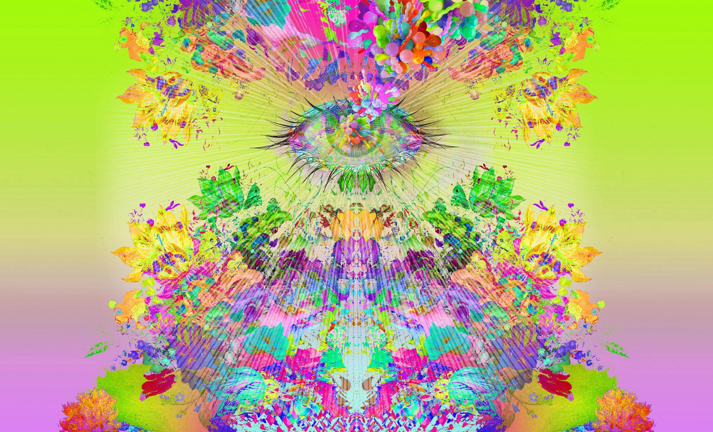 The Joy of The Ninth Eye, digital painting on acrylic and aluminium, 100 x 60,6 cm – – – In some mystical traditions, the soul must go through nine stages of unveiling to achieve ultimate vision. Dante also shows the path through the nine spheres of understanding in The Divine Comedy. – True seeing requires not only the undressing endless veils but also the touching of the blooming and bubbling side of reality. The ninth eye sees through the shades of illusion, but also reaches new, more sparkling colors.