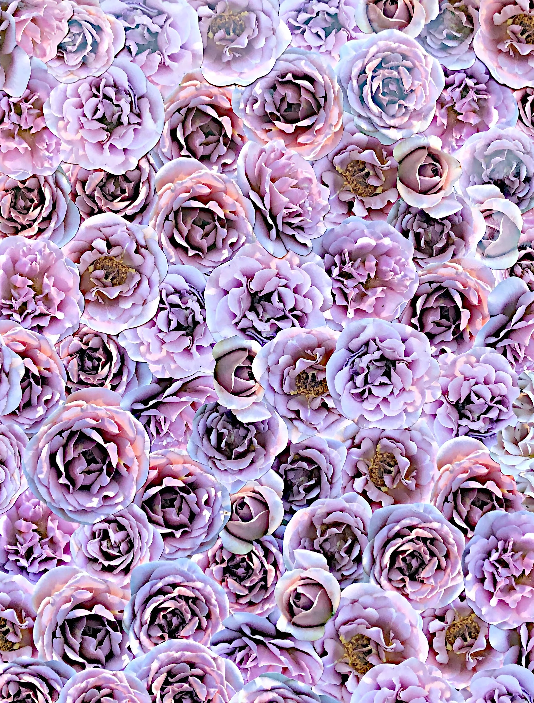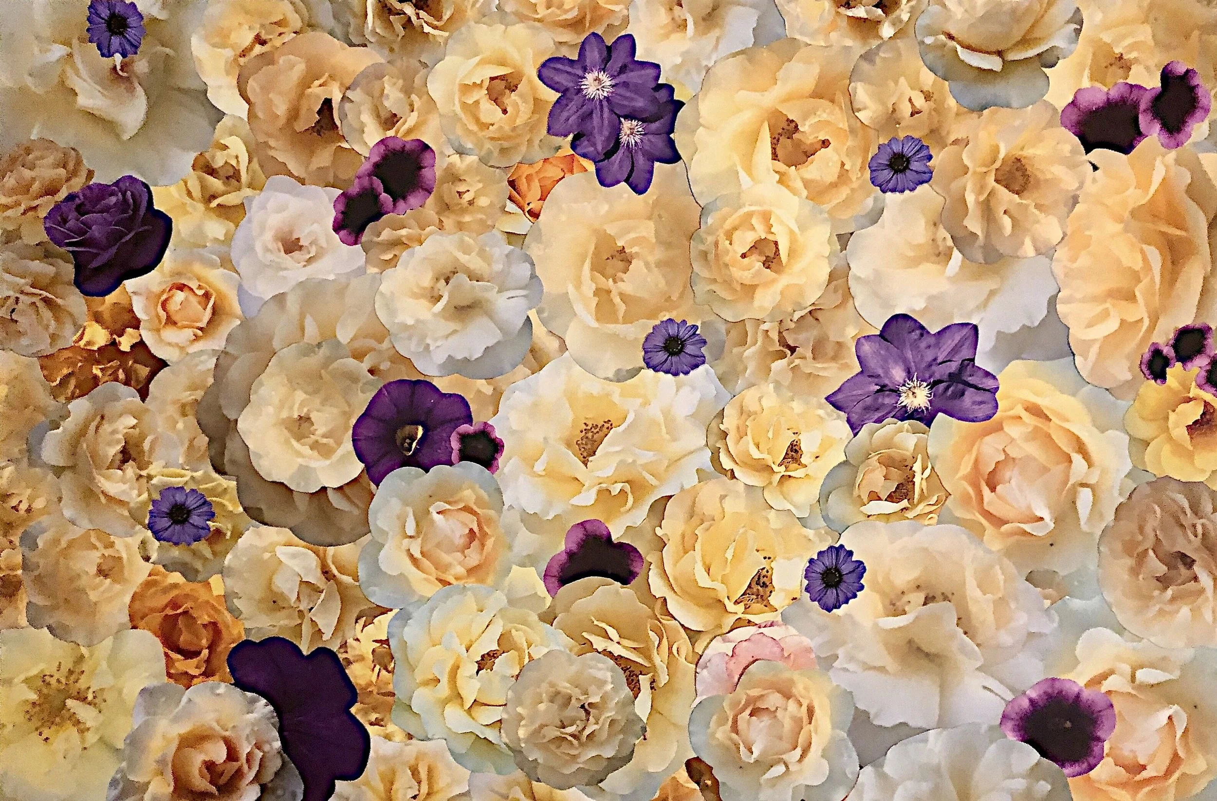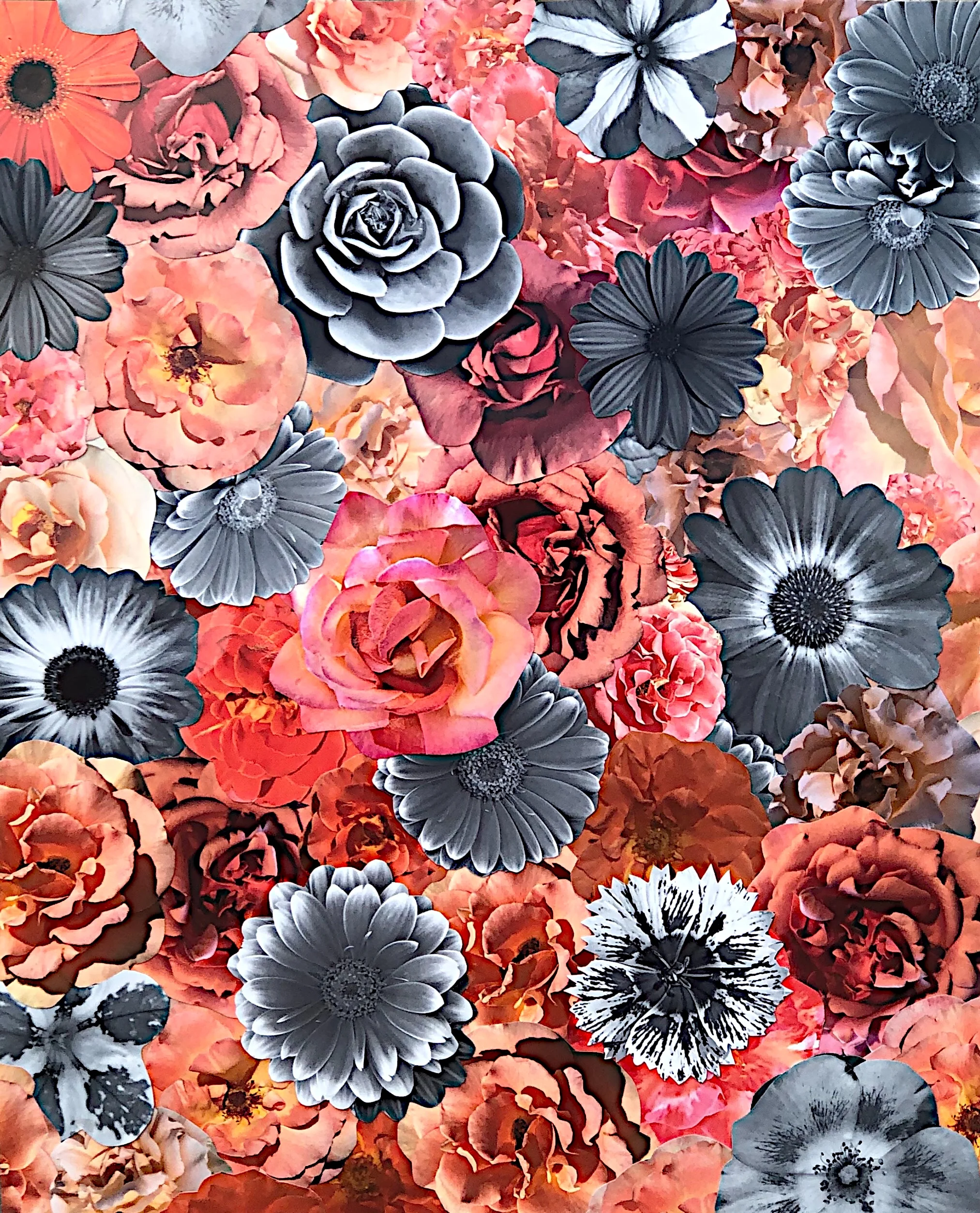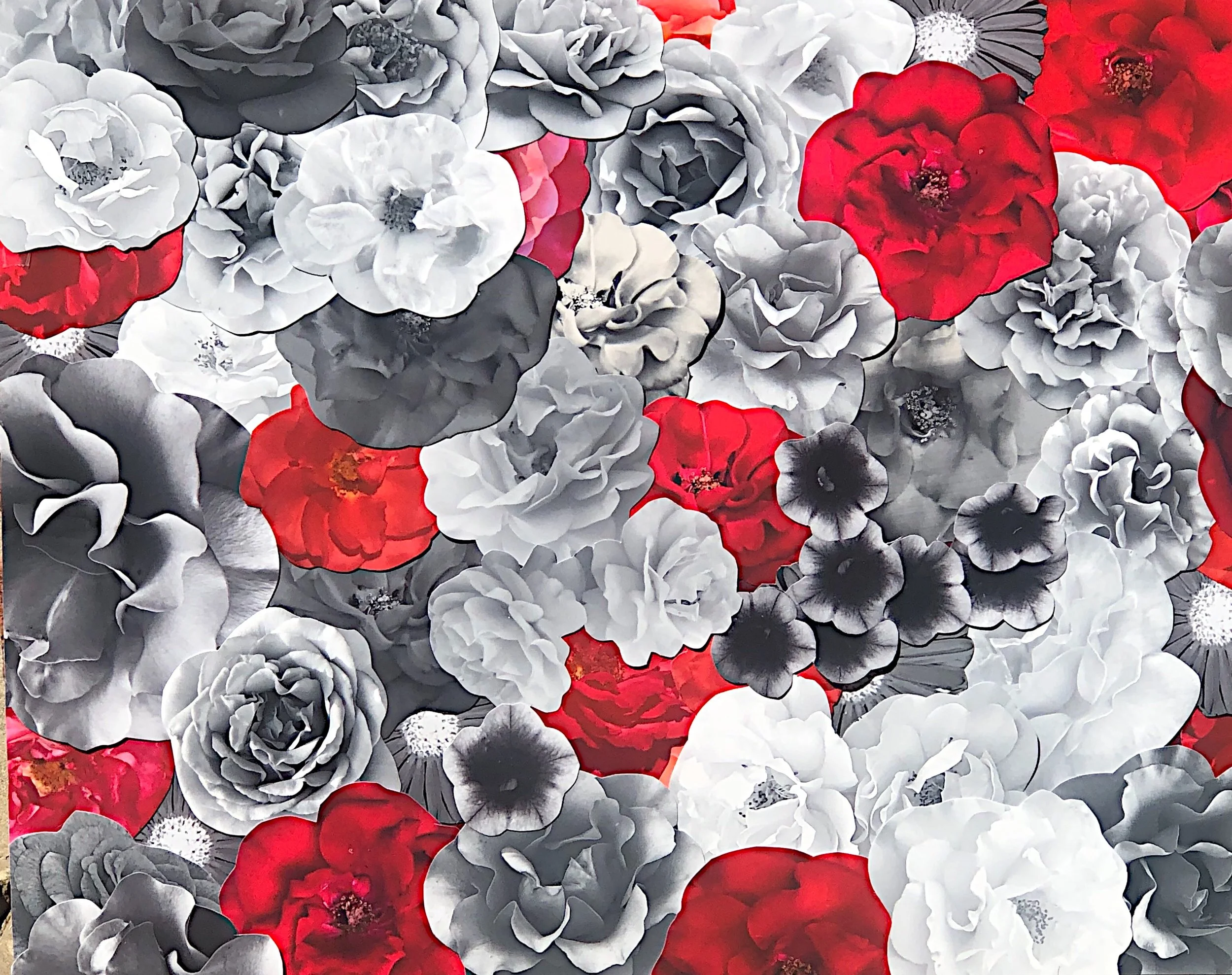 The photographs I use are my own, except for a few I have received from personal friends. They are never downloaded from a website. I take pictures of flowers everywhere I go, and being alert to the presence of a blossom initializes the intention of my work — to make people feel better, if only for a moment. I often use dozens of flowers in a single work. It is a process I find meditative, and a quality that carries over into the execution of the work.