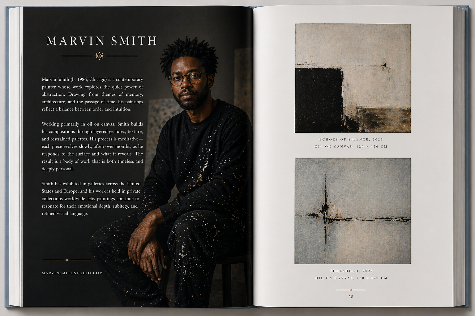 Each awarded artist is featured in the hardcover, museum-quality book Premier Artist Prize 2026 with a dedicated double-page spread, including their website, artist statement, and two selected artworks.
